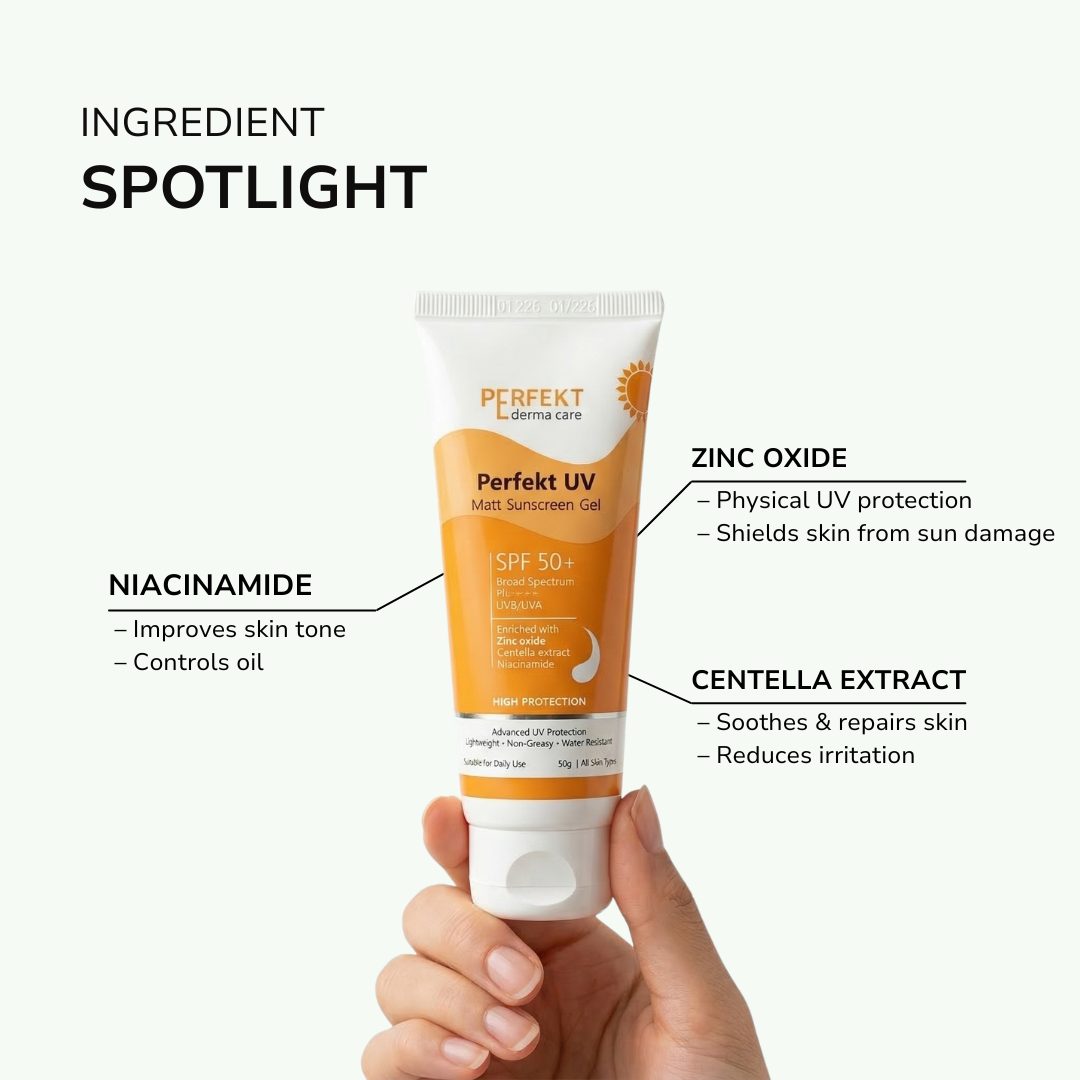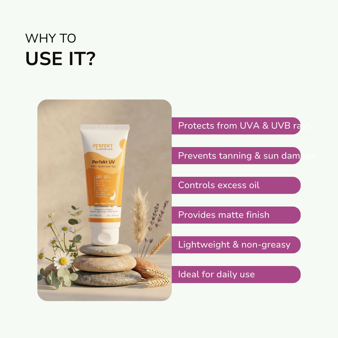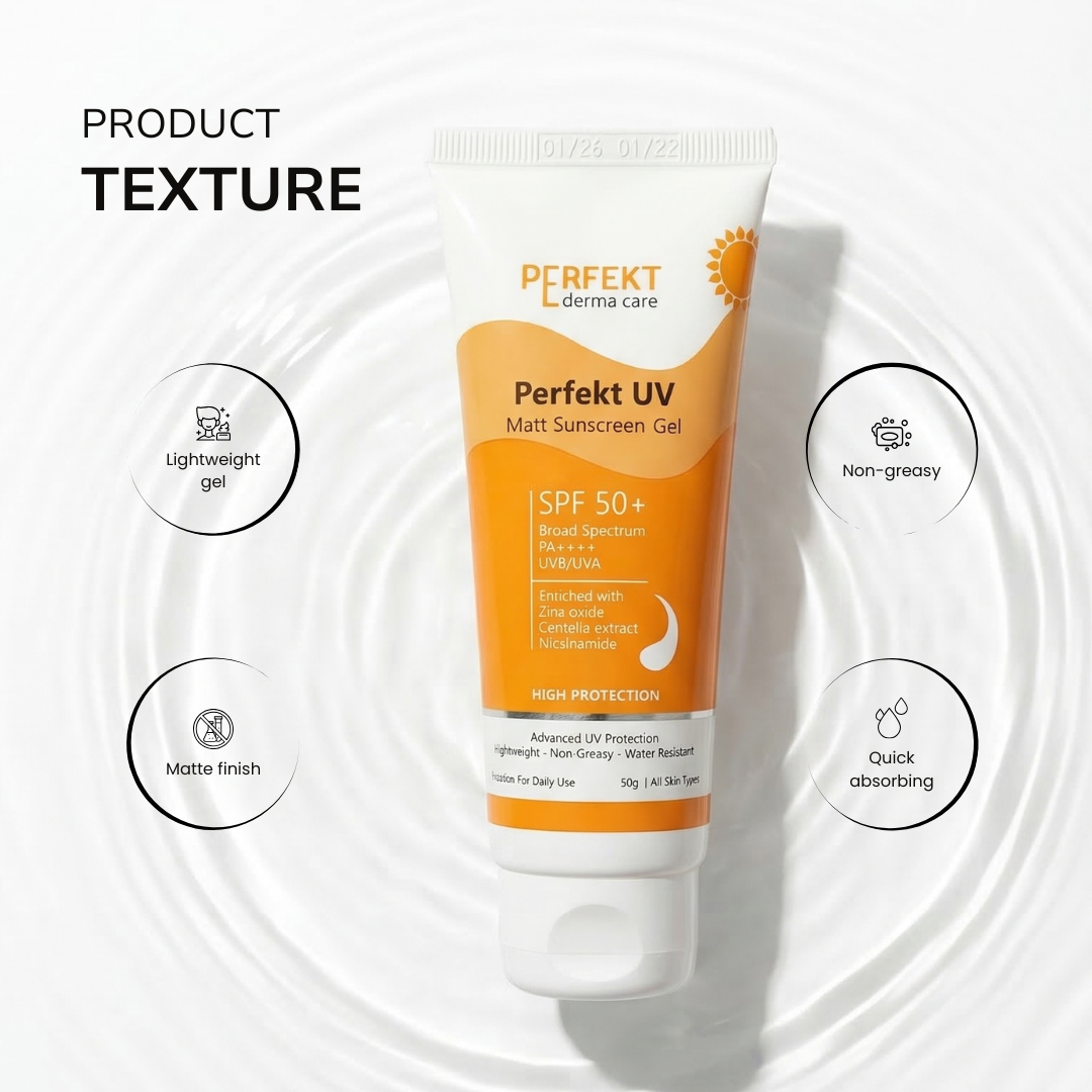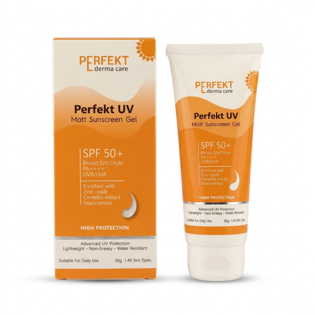Perfekt UV Matt Sunscreen Gel is an advanced dermatological sunscreen designed to deliver high-performance sun protection while maintaining skin comfort and breathability. With SPF 50+ and PA++++, it provides broad-spectrum defense against both UVA and UVB radiation, helping prevent tanning, sunburn, pigmentation, and premature skin ageing caused by sun exposure.