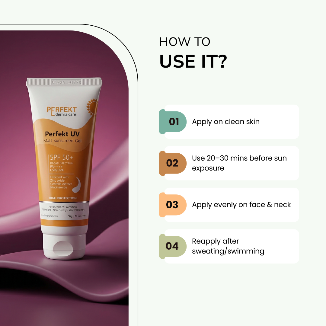 Apply Perfekt UV Matt Sunscreen Gel generously and evenly on the face, neck, and exposed skin 20–30 minutes before sun exposure. Reapply after swimming, excessive sweating, or prolonged sun exposure for continued protection.